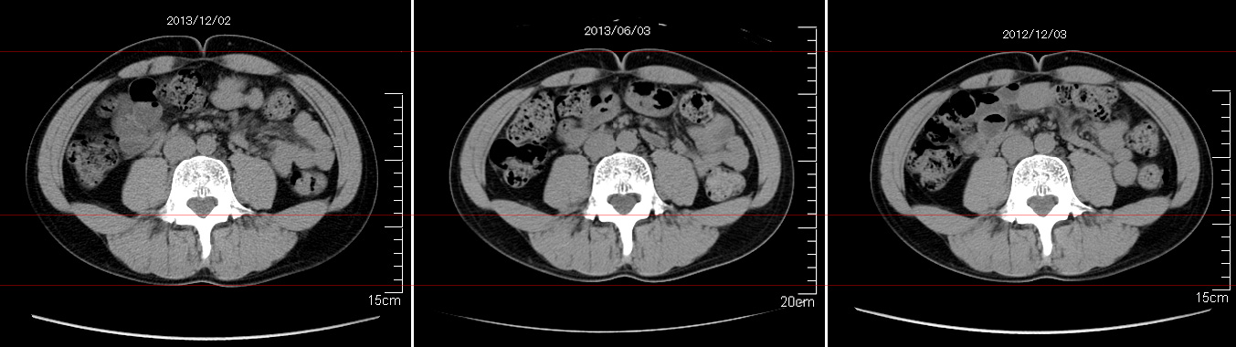 2006年入院治療の退院日から10年。 かなり大きな節目なんだが、なんだろうこの軽い感じは(笑)。 「10年生きたんだぁ」くらい。 変わったような変わっていないような。 当時は10年後なんて全く考えていなかった。 今も10年後は考えていないが・・・。 退院前日の2006/10/31は46.6kgだった。 今日計ったら54.8kg。体脂肪は16.6%。 とても健康にストレスなく生活できていることに、治療当時から現在に至るまで、関わった人全員に感謝の気持ちです。 マーカー、CT画像、問題なし!! 血液検査結果もほとんど文句なしの正常値。 そうだなぁ、数値に出ない異変としては、肩凝りかなぁ。 一旦夏になくなったと思ったが、初秋から再発。 マウスを左手にしたり、シップ貼ったり、最近はホッカイロ貼ったり。 で、一向に良くなる気配がない。 やはり四十肩なのか。 でも肩の可動域は問題ない。動かせないような痛みも無い。 結局色々考えてたどり着いたのは「変形性頚椎症」ではないかと。 肩凝りや頭痛がダラダラと続くようになるという症状がピッタリ当てはまる。 さて、改善策がなかなか難しい。 整形外科行ってもレントゲン撮って湿布をくれるだけだろう。 そんなことに大金を出すならまずは300円/回のプールで泳ごうと思う。 重力から開放して全身運動をするのが一番良いらしい。 2015年の目標は少しでも良いから水泳を再開する、だな。 マーカー、CT画像、問題なし!! 通常の血液検査結果も文句なしの正常値がズラ~っと並んだ!! 間違いなくヨメの食事のおかげである。ほんとうに感謝である!! ちなみに最近少々腰周りの肉付きが気になっていたのだが・・・。 左から2013年12月、2013年06月、2012年12月と背骨の位置は合わせて並べてみた。 6月まではあまり変化がなかったが、この半年で明らかに違う。 背中側の脂肪がやや増えてはいる。 でも最も大きな違いは、腸なのか、やたらと内臓が膨れている・・・。 一言で言うと食べすぎ?!?! 食事は野菜中心ではあるが、確かによく食べているw。 せっかくスーツのウエストを詰めたんだからこれ以上にならないようにしたい。 「腹八分目を心がける」かな。