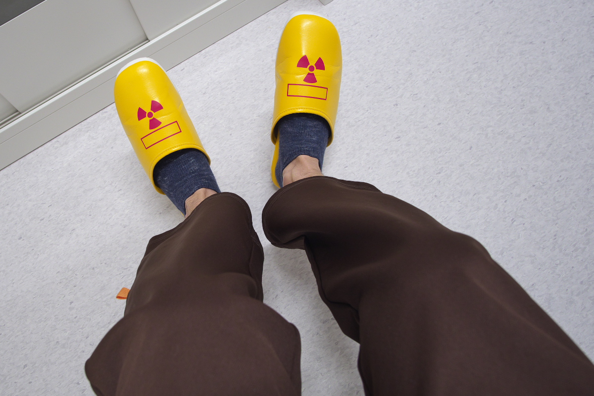 相変わらず0.1でギリ陽性を維持。 まあ上がらず横ばいなのでOKだな。 先生も全く気にしていない様子。 とはいえ「次回は9月にCTと採血ね」と抜かりなし(笑)。 2/16に採血とCT撮影をしてきた。 【4月】 時間厳守で8:15頃に核医学科を受付。 更衣室に案内されて着替え。 ロッカー開けてスリッパを見て一人爆笑(笑)。 誰もいないのでスリッパの写真を撮る。 続いて検査手順の説明を受ける。 ・投薬 ・1時間休憩 ・水分はたくさん摂ってください ・20分撮影 ・30分休憩 ・誰にも何も言わずそのまま帰ってよし とのこと。 そして静注用のライン取り。 血管が細く看護婦も悩み、少々時間を使う。 でも慎重に血管を選び抜き一発でライン確保。 さすがである。 血管にラインが入っている感覚、一瞬で抗がん剤治療時の腕の感覚が蘇るから不思議だ。 そしていきなり1時間休憩。 何も持ち込みできないので、ただただボ~ッとする。 これにも理由があって、筋肉を使うとそこに薬剤が集まってしまうらしい。 だから「何もしない」でなければならない。(と帰宅後にヨメから教わる) 体内というか細胞に薬剤が行き渡ったら20分ほどかけて撮影。 CTの機械を少々長くした程度のものだった。 気分的にもCTと同じ。 体勢は腕を横にしてきをつけの姿勢。 いつもは万歳の姿勢なので少し画像が変わりそうだ。 撮影後は30分休憩。 こちらは半減期との兼ね合いのようだ。 俺自身が放射線を出しながら街中を歩いて電車に乗るわけにはいかないということかな。 γ線エリアモニタなるものも所々に設置されている。 空間線量を計測している模様。 俺が近づいただけで0.1から12.0までどんどん上昇した。 俺自身が放射線を出しているということで、ちょっとおもしろい(笑)。 というわけで、本来であれば悪性腫瘍を疑われての検査なのだけど、あまりにも経験したことのないことばかりで、逆に楽しんでしまった(笑)。 結果は12/16。 これまたどんな画像が出てくるのかが楽しみ。