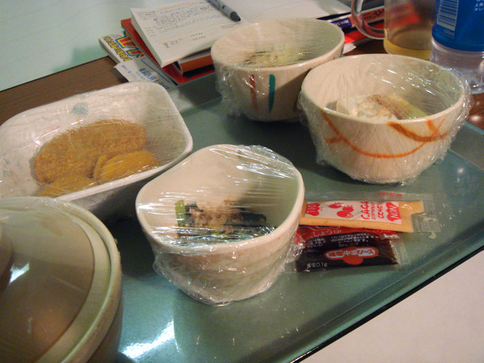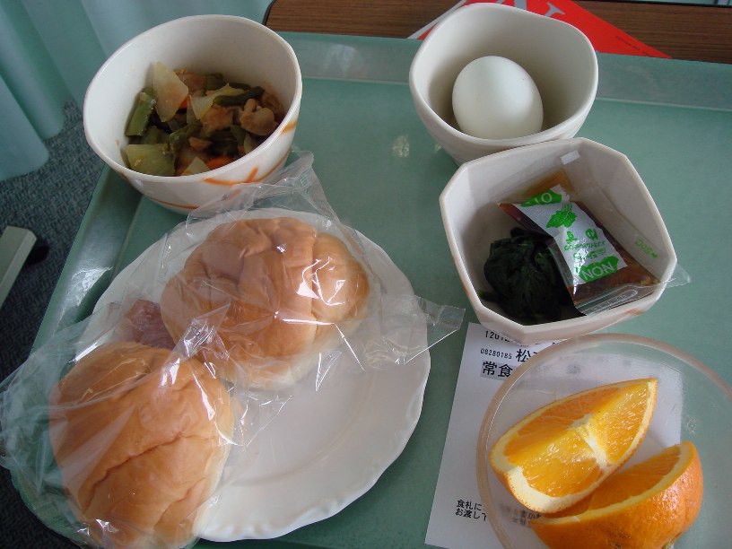 36.6℃/53.2kg 【朝】 便出ないため坐薬。(たぶんレシカル) お粥以外2/3。 腹がゆるい。座薬のせいではないらしいが。 9:30 ノイアップ、シップ交換。 【昼】 うどん2/3 WBC:1200 と変化なし。上昇見られず。 16:00 ブルガリアヨーグルト。牛乳。 【夜】 米1口。おかず1/3。チーズ。 22:00 横になると腹痛→トイレに行くと何もでない。 というのを4回繰り返す。 【その他】 便×4、ブレオ延期(WBC待ち)、タケプロン、レシカルボン坐、ノイアップ注 36.4℃/53.2kg 【朝】 恐怖の枕にはなっていなかった‥(抜け毛で枕が毛だらけになるかと思った‥) 気分良いね。水分も飲みやすい。たぶんこの感覚が普通なんだな。「普通の感覚」は「異常」の後に「普通」になったから思い出した、みたいな。 あさ新聞屋が各病室に朝刊を売りに来るのだが、これが大人気。暇なおじいさんたちには特に。まあテレビか新聞くらいしかないか。俺?FMラジオ。あるいは何もしない。 朝食:かゆ1/3、ソーセージ4切れ、みそ汁1/2。苦しい‥。 11:30 ボウズにした(2mm) 12:00 ヨーグルト 【昼】 生姜焼き、なす味噌煮、ツナサラダ、メロン、各少々。 14:45 ノイアップ100μg注。 白血球:1200 好中球:300と減少のため。マスクする。 15:30 両親がsizzlerのステーキ、ポテト、ハンバーガーを少し持ってきた!!ハンバーガーはその場で完食。ステーキ4かけら、ポテト1個。17:00親帰路へ。 【夜】 ステーキとポテトの残り。病食は少々。ハンバーガーが効いている‥。 20:00 最初の点滴の血管が硬い。現在の点滴ラインは抜いてもらう。圧力、腕の角度によっては痛い。8/26と関係ありか?シップを貼る。 21:00風呂 【その他】 タケプロン、ノイアップ100μg注