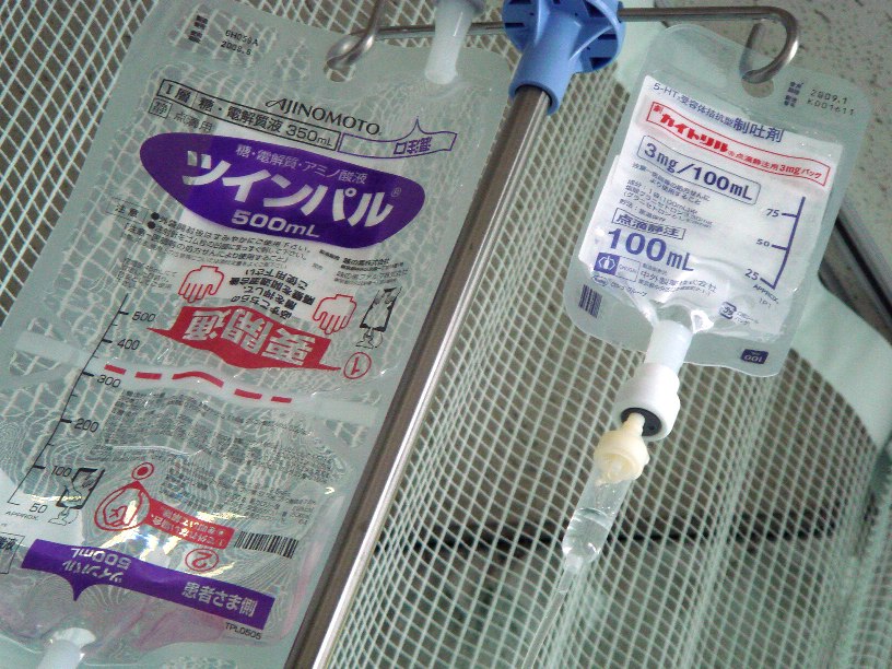 36.4℃/53.4kg 【朝】 ロールパン1/5、ヨーグルト少々。 9:50 点滴開始。 【昼】 ヨーグルト3口。ロールパン1口。 今日より病室がまた満室。年齢は70-80歳:4人、60歳位:1人、俺33歳。 15:45 ヨーグルト6口 ┓ 16:45 ロールパン1口 ┻食いすぎだった 【夜】 スープ2口。ほうれん草少々。きゅうり2枚。トマト1口。たら少々。 19:30 洗髪洗顔 21:00 ヨーグルト1口 【その他】 ゾフラン、タケプロン、レンドルミン、胸部XP 嫁がクラプトンのチケットを予約してくれた!!12/2さいたまアリーナ 36.4℃/54.0kg 【朝】 ロールパン1個。チーズ1/2。 9:00~ 腹痛 11:00 嘔吐 だめだこりゃ。点滴を希望する(500ml)。ライン確保。今回の先生もウマイ。 12:00 鐘の音が聞こえる。 13:00 嘔吐 15:00 嘔気再来。でも何も出ず。 16:15 カイトリル点滴。(制吐)(またかいな‥。まぁいいけど。もうおさまってきたのに。)今回はステロイド入りだった。へ~。 18:00 点滴終了。むくんだ。 18:30 そば三口。ヨーグルト少々。 ゾフラン4mg(制吐剤)→通常はルーチンで処方するらしい。抗癌剤投与終了後に副作用制吐目的。ふむふむ。 レンドルミン飲まず。 【その他】 ゾフラン、尿500ml 36.8℃/54.4kg 【朝】 点滴やら採血でだいぶ血管が穴だらけだな。 7時 そば。グレープフルーツ一切れ 8時半 トマト一切れ。オレンジ二切れ。大根四切れ。魚の練り物一切れ。 10時半 そば。グレープフルーツ一切れ。 【昼】 食べる作業は疲れる。 鳥のささ身少々。メロン一切れ。焼きそばパン1/2。 トイレで、、、グレープフルーツの粒が消化されずにそのまま出てきたぞ!おまえら体内を通過しただけかよ。何のツアーだいそれは。 【夜】 そうめんを買ってきてもらう。 嫁がしんどそうだ。 食後すぐに腹が一杯に感じ持続して不快。睡眠も無理。 G先生:「もうちょっと水分と食事が取れれば」 カマのせいで腹がゆるく水分の取りずらい一日だった。内臓が炎症をおこしてるのだろうとのこと。 【その他】 タケプロン、レンドルミン、便×8(カマ中止する)