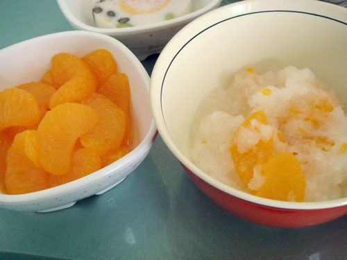 米2口。すきやき。みかん(缶)。大根・みかん酢の物少々。どういう組み合わせだ全く。缶みかん物が二つもある・・・。